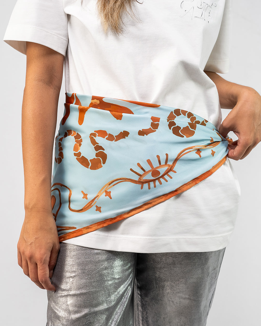 Nuestra pañoleta sublimada está diseñada para elevar cualquier look con un toque sutil de magia. Su estampado ilustrado bajo nuestro universo lo hace perfecto para combinar con nuestras camisetas y faldas wrap.